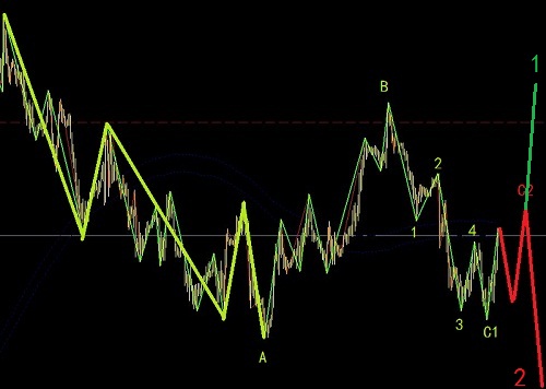 歐元的第一波下跌也就是波浪理論圖解中的A浪部位時間花了不少,行情不過360點,這種數(shù)不清的東西可以是A浪和1浪2種,而就在臨近的行情中再次出現(xiàn)了標準的空頭五波,這里可以看成C浪1,后面C浪2中回調進場做空這是第一種判斷,也就是市場按標準的運行-另一種直接新高,你認為的5波卻演變成了調整浪。